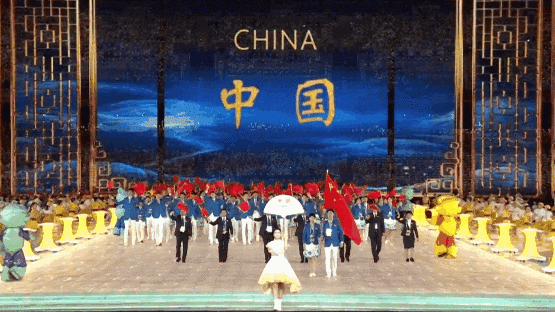 东道主中国代表团入场,游泳运动员覃海洋、篮球运动员杨力维担任旗手。