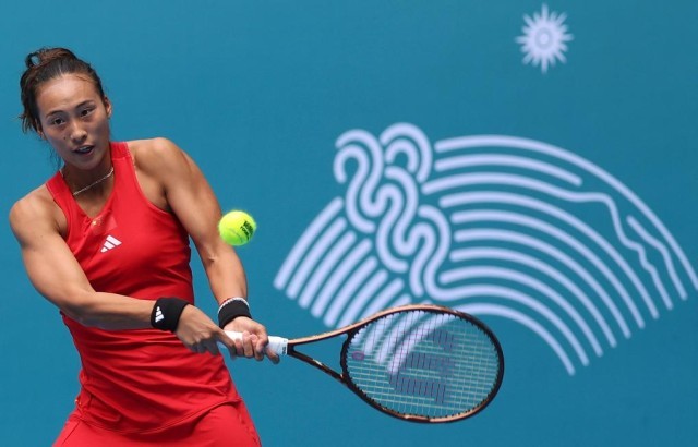 9月25日,郑钦文在比赛中回球。新华社记者 孟晨光 摄