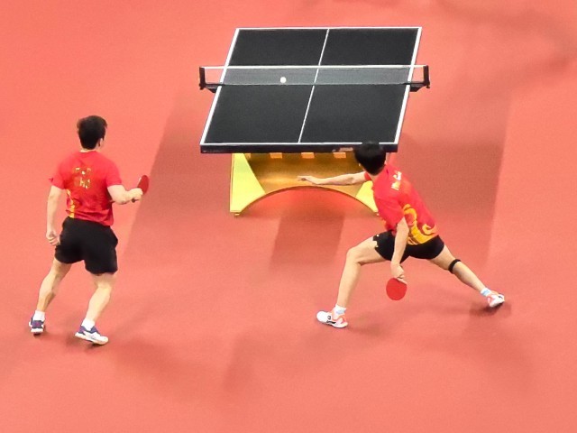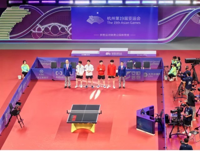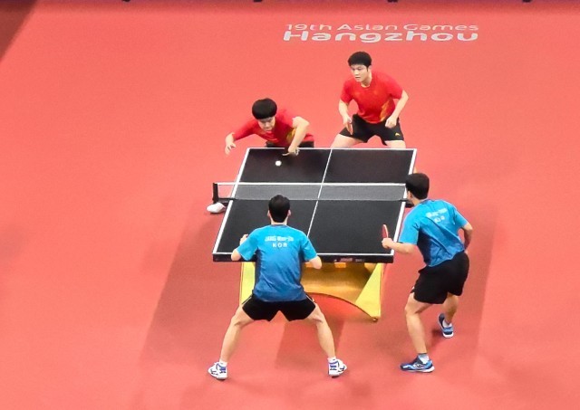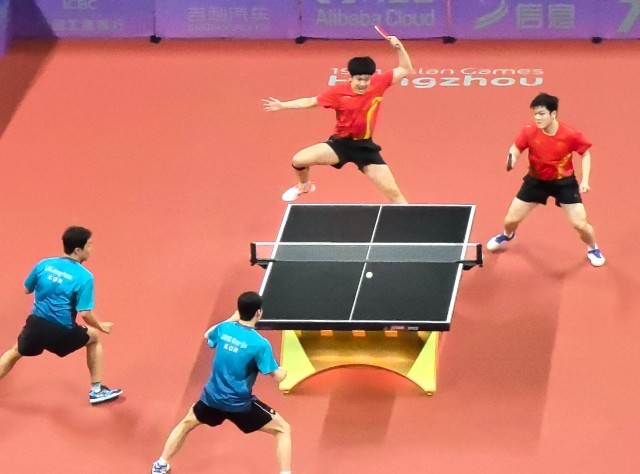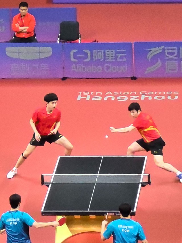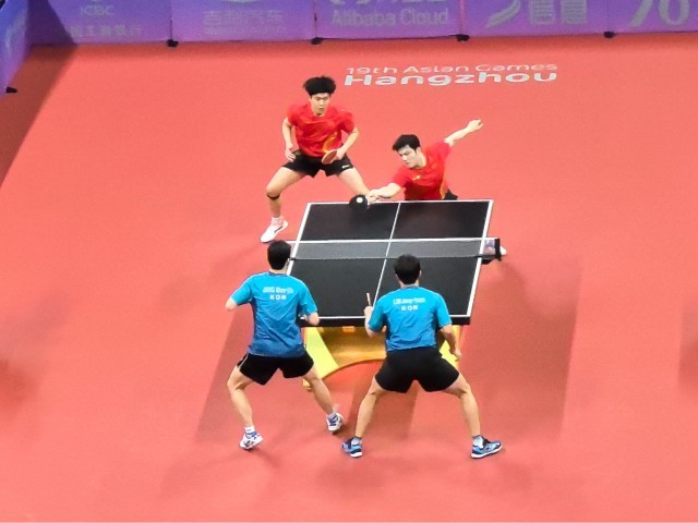 10月1日晚,杭州亚运会乒乓球男双决赛,在拱墅运河体育馆进行。中国组合樊振东/王楚钦在和韩国组合张禹珍/林钟勋的比赛中兵不血刃,以11:6、11:8、11:7、11:3连下4局击败对手,拿下了男子双打金牌。本场比赛,樊王组合完全是碾压式的胜利,几乎没有给对手多拍的机会。比赛打到后来,张禹珍、林钟勋已经放弃了抵抗,樊振东、王楚钦轻松获胜。(中青报·中青网记者 杨屾 文并摄)