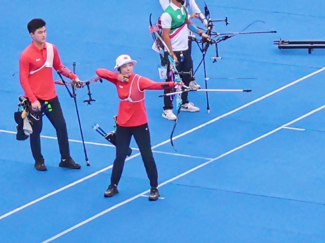 10月4日,杭州亚运会射箭项目混合团体1/4决赛,在富阳银湖体育中心举行。中国组合海丽玕、魏绍轩以0:6不敌伊朗组合法拉赫、沙巴尼止步8强。比赛中,女选手海丽玕在第二局第一箭中,出现了罕见的脱靶,这在很大程度上影响了个人和团体的发挥。赛后,中国组合和教练,都没有接受采访,海丽玕因为这次失误非常自责,有队友一直陪伴在已经哭红双眼的海丽玕身边,安慰她的情绪。(中青报·中青网记者 杨屾 文并摄)