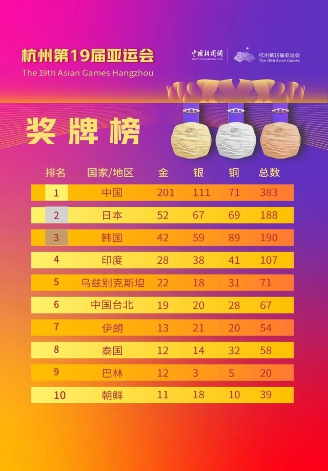 杭州亚运会将于8日晚闭幕。中国体育代表团副团长周进强在采访中表示,中国体育代表团本届获得了201金111银71铜共383枚奖牌,取得亚运会参赛历史最好成绩。