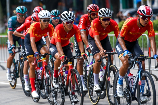 中国男子公路自行车队在环广西公路自行车世巡赛中。组委会供图