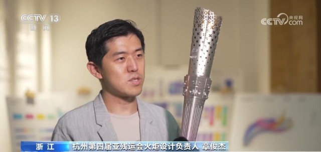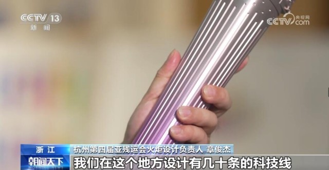 杭州第四届亚残运会火炬设计负责人 章俊杰:玉琮是实证中华五千年(文明史)的良渚(遗址)文明当中的一个重要礼器,我们把玉琮作为核心意象,外方内圆,我们在举起火炬的时候,所有人的视觉焦点玉琮它承上启下,分别代表了不同的寓意。承上,我们用点点的星光汇聚成桂花桂冠,可以看到星光越来越稠密,这是我们希望体现整个火炬设计的积极向上的那种力量感;玉琮往下,在这个地方设计有几十条的科技线,它就好像是绵延着人类的历史和城市科技的脉络。