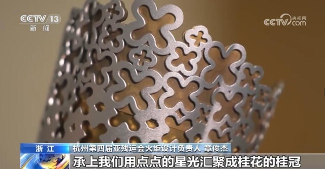 这就是火炬“桂冠”,它的设计思想源自良渚玉琮和杭州市花“桂花”。