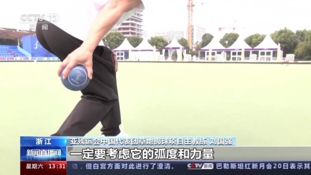 亚残运会中国代表团草地掷球项目主教练 刘国强:这个球是走不了直线的,一定是有弧度的,所以我们在投掷球的时候一定要考虑弧度和力量。球会随着滚动,随着不断前进开始慢慢转弯,最后停在这条中线上。不同距离的弧度以及不同力量的弧度,都要通过不断地训练来掌握。