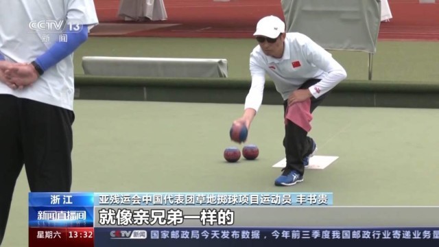 亚残运会中国代表团草地掷球项目运动员 丰书贵:刚上手的时候,这个球一滚出去,方向都不对。通过我们日复一日,慢慢地跟他磨合,我跟引导员配合就像亲兄弟一样的。有时候一枚球投出去,我的教练说丰书贵好球好球,那时候我感觉到无限的快乐。