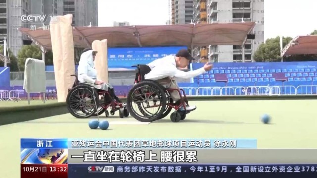 亚残运会中国代表团草地掷球项目运动员 徐永刚:像我们训练的时候一直坐在轮椅上,腰很累,慢慢去适应去克服。一个是力量,一个是弧度,对我们这个球来说这两样最重要了。只能不停地练、不停地去感受。