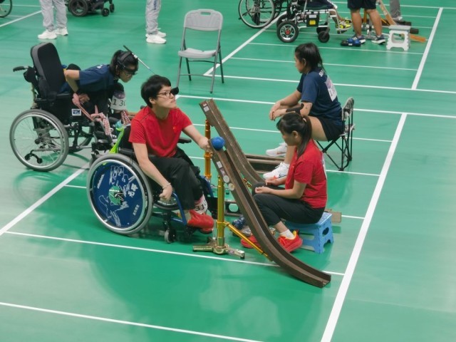 硬地滚球是最具包容性的残疾人运动之一,专门为脑瘫患者、严重躯体功能障碍的运动员而设立。这项运动的规则与冰球较为相似,双方各执六枚不同颜色的球,谁投出去的球最终距离目标白球的距离最近,就会赢得积分。对于杨贝贝来说,赛场上需要时刻保持清醒的头脑,根据场上局势部署球路,还需要精准“控制”轨道和出球点,才可以每一次投球都能有效。
