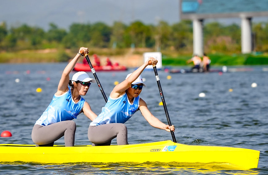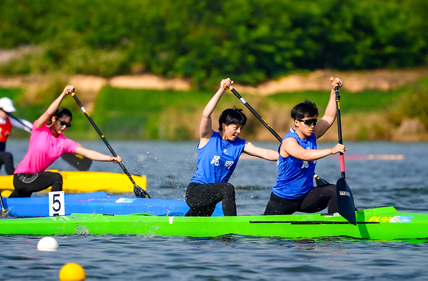 在紧接着的女子双人划艇500米决赛中,昆明市代表队李丽与搭档严红艳并肩作战,她们不畏强手,在最后100米距离奋力冲刺,以1分56秒525的成绩强势夺冠。