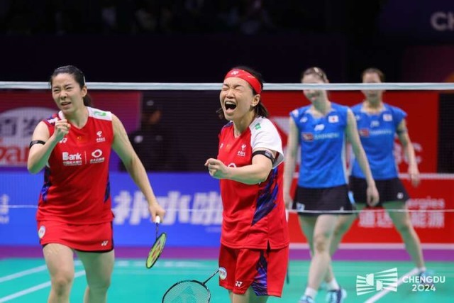 5月4日中午,2024尤伯杯半决赛,中国队3:0战胜日本队。图为中国队第一、双打陈清晨/贾一凡(左)以2:1战胜日本组合松山奈未/志田千阳。赛事组委会供图