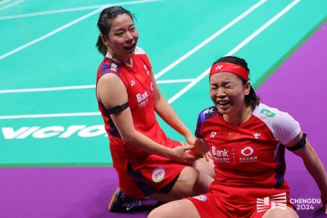 5月4日中午,2024尤伯杯半决赛,中国队3:0战胜日本队。图为中国队第一双打陈清晨/贾一凡在赢下比赛之后,陈清晨(右)泪流满面。赛事组委会供图