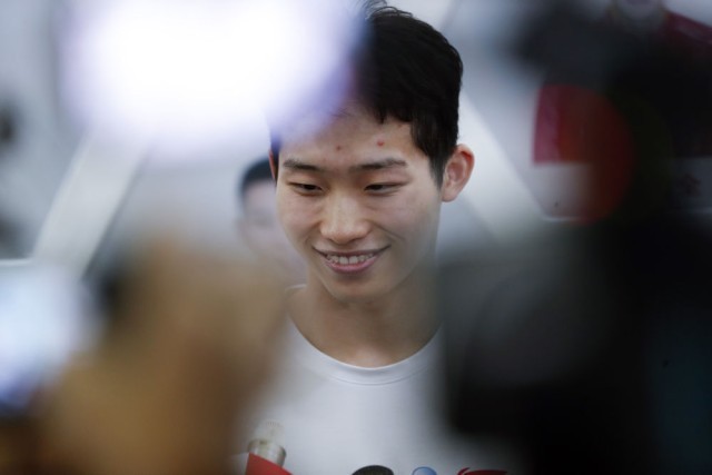 5月7日,中国跳水队队员王宗源在训练后接受采访。新华社记者 雒圆 摄