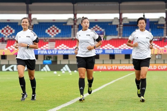 中国裁判谢丽君(左一)和方燕(右一)在2022U17女足世界杯中。视觉中国供图