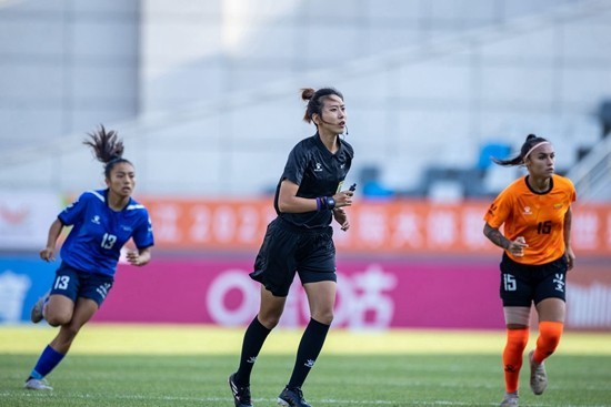 5月10日,董方雨和谢丽君在2023亚足联女子亚冠联赛邀请赛决赛执裁。这是中国女裁判的第二次洲际赛事决赛执裁。董方雨供图