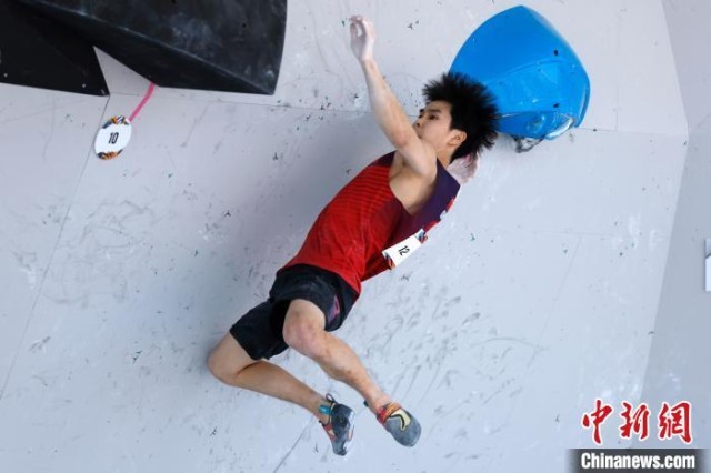 5月16日,中国选手潘愚非亮相奥运会资格系列赛上海站男子攀岩全能预赛--攀石项目。 中新社记者 富田 摄