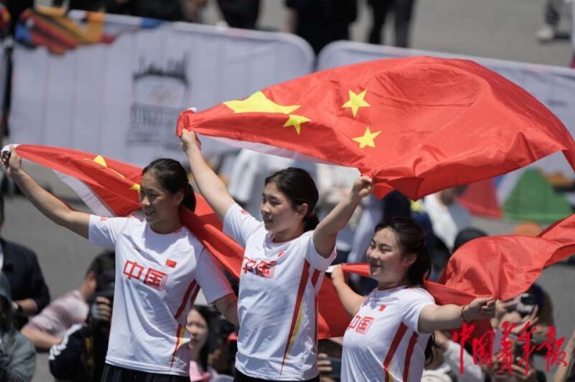 5月18日上午,上海,在奥运会资格系列赛上海站女子自由式小轮车决赛中,孙思蓓(中)、孙佳琪和邓雅文三名中国选手包揽决赛前三。孙思蓓在第2轮压轴出场,以全场最高的95.86分夺冠,孙佳琪和邓雅文分居二三位。 中青报·中青网记者 李隽辉/摄