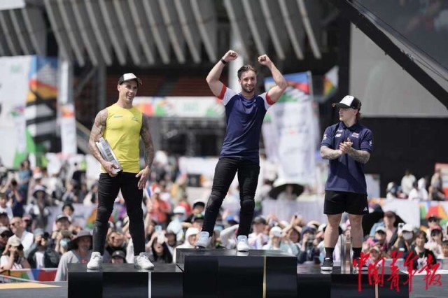 5月18日,上海,奥运会资格系列赛上海站男子自由式小轮车决赛,东京奥运会该项目冠军澳大利亚选手L. MARTIN(左)排名第二,第一名被法国选手A. JEANJEAN(中)获得,英国选手D.D.K. REILLY获得第三名。执教中国队的委内瑞拉传奇选手D. DHERS只获得第十名。中青报·中青网记者 李隽辉/摄