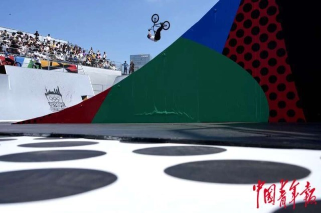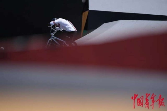 5月18日,上海,奥运会资格系列赛上海站男子自由式小轮车决赛,英国选手D.D.K. REILLY在第二轮比赛失误后离场,他凭借第一轮比赛的出色发挥获得第三名。中青报·中青网记者 李隽辉/摄