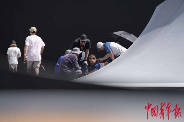 5月18日,上海,奥运会资格系列赛上海站男子自由式小轮车决赛,最后一个出场的美国选手M. CHRISTOPHER失误后受伤倒地。中青报·中青网记者 李隽辉/摄