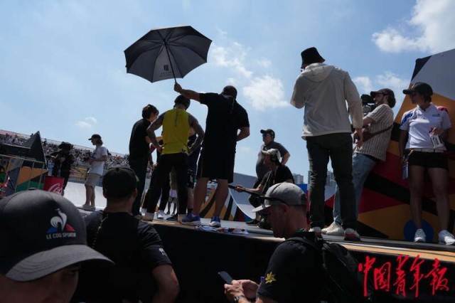 5月18日,上海,奥运会资格系列赛上海站男子自由式小轮车决赛,澳大利亚选手L. MARTIN(黄衣)在赛后接受采访,他是上届奥运会的冠军,本场决赛获得第二名。中青报·中青网记者 李隽辉/摄