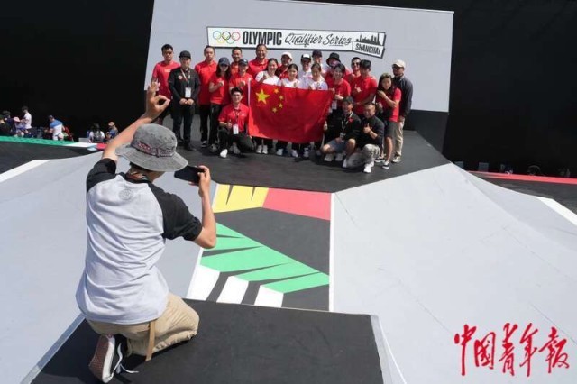 5月18日,上海,奥运会资格系列赛上海站男子自由式小轮车决赛,比赛结束后,中国队选手和教练在场地合影。中青报·中青网记者 李隽辉/摄