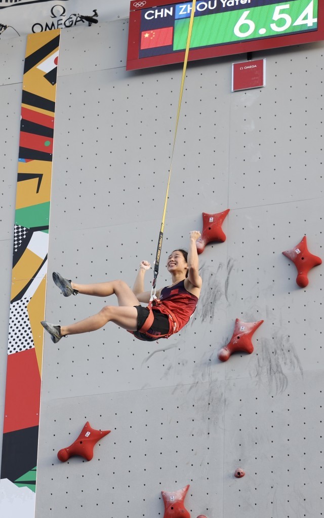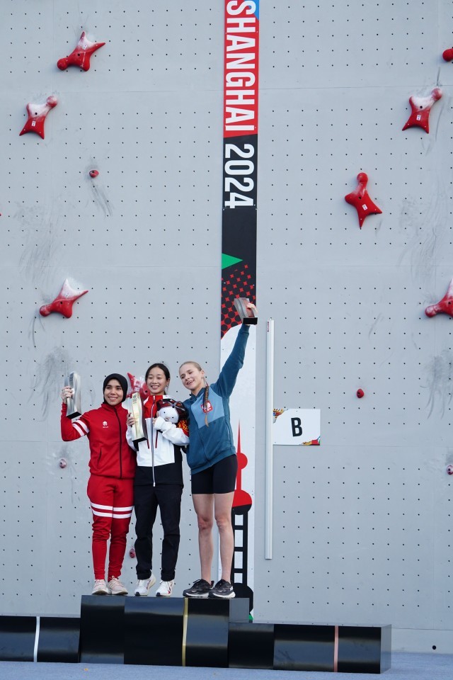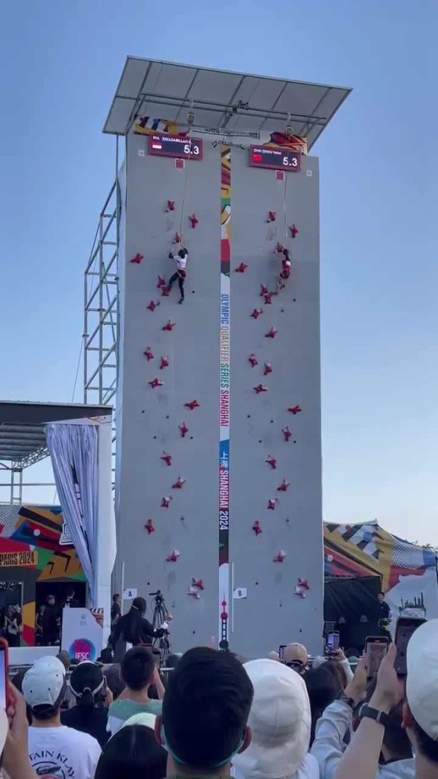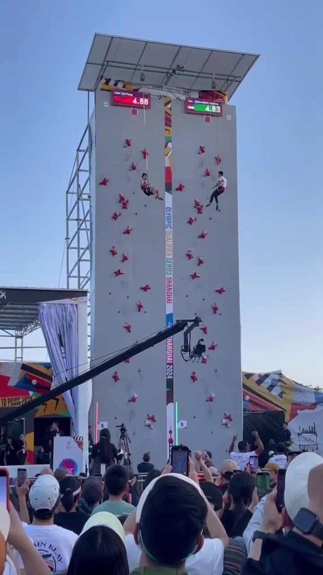 5月18日,黄浦江畔,巴黎奥运会资格系列赛上海站继续进行。在攀岩女子速度赛决赛中,中国队选手周娅菲以6秒54的成绩夺得冠军;在男子速度赛决赛中,中国队选手伍鹏、王欣尚分获亚军、季军。