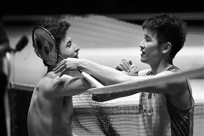 石宇奇(左)与李诗沣在比赛后互相致意。新华社发(邓智炜摄)