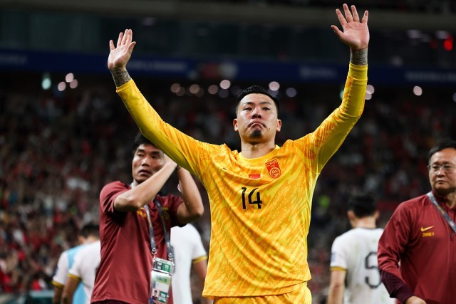 6月11日晚,国足客场0:1不敌韩国队,但仍然晋级18强赛。图为守门员王大雷赛后向球迷致谢。视觉中国供图