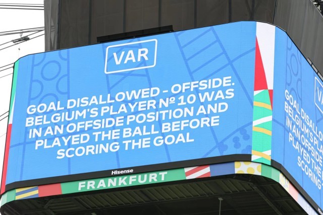 比赛现场大屏显示VAR判罚公告:比利时队10号球员卢卡库的进球因越位在先无效。小江供图