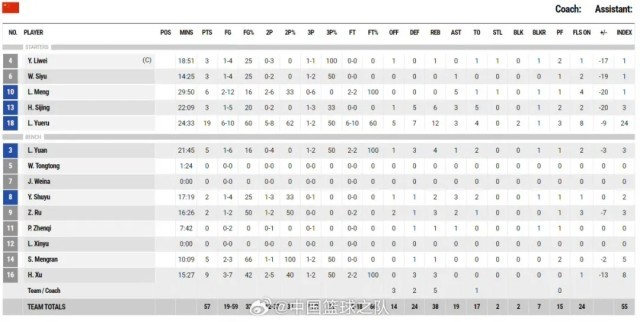 整场比赛,中国队三人得分上双。球队投篮命中率、罚球命中率回升显著,篮板球同样占优。