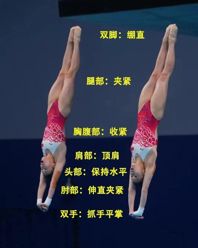 通过观察比赛的慢镜头回放以及跳水过程中拍摄的照片,不难发现,能将水花压得很小的运动员,入水前的动作几乎都具有如下特点: