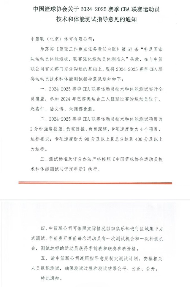 央视网消息:北京时间8月12日,CBA官方发布公告,新赛季实行全员体测,参加奥运三人篮球项目的四人免测。在季前赛开始前,每名运动员有一次测试机会和一次补测机会,达标的运动员才能获得季前赛和联赛参赛资格。