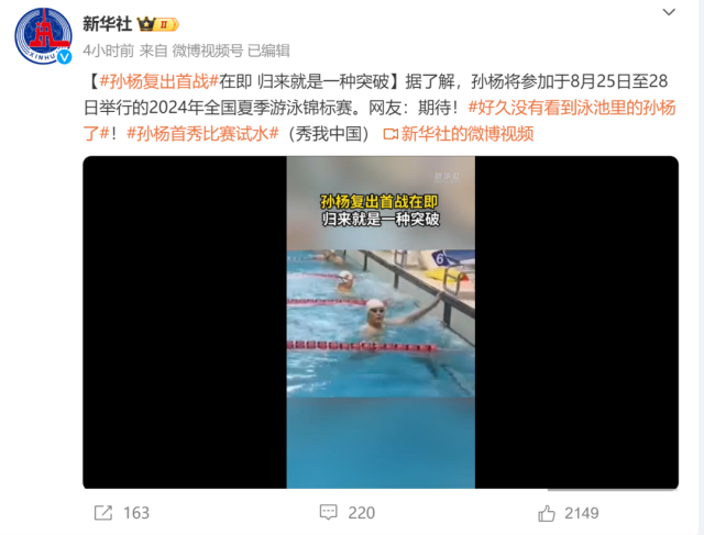 此前,孙杨曾说:“可能很多人会问我‘你愿不愿意坚持到2028年?’,我觉得就是顺其自然,如果有机会,我就全力以赴,如果没有,就是坦然放下。”