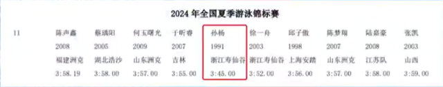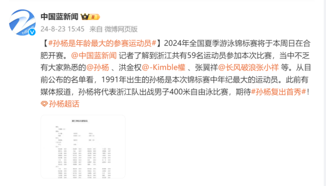 比赛首日,他将参加男子400米自由泳项目。浙江广电集团融媒体新闻中心记者从最新的秩序册看到,孙杨报项成绩为3分45秒。1991年出生的孙杨是本次锦标赛中年纪最大的运动员。他2012年创造了男子400米自由泳奥运会纪录。