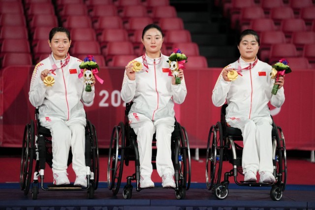 2021年9月3日,在东京残奥会乒乓球女子团体4-5级决赛中,中国队以2:1战胜瑞典队夺得金牌。图为中国队张变(左)、周影(右)、张淼在颁奖仪式上。新华社记者 朱炜 摄