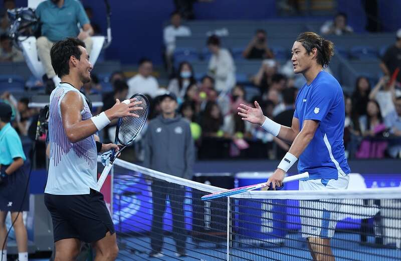 9月23日晚,中国选手张之臻、布云朝克特在ATP杭州公开赛男单半决赛结束后握手。视觉中国供图