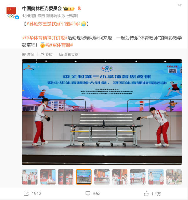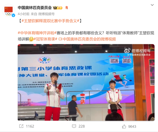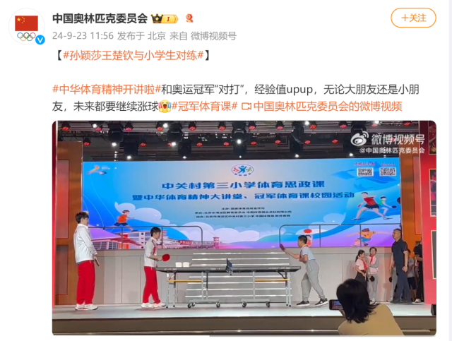 9月23日上午,北京市海淀区中关村第三小学迎来了两位特殊的“体育老师”。奥运会乒乓球冠军王楚钦、孙颖莎来到校园,全场学生坐不住了,尖叫欢迎。