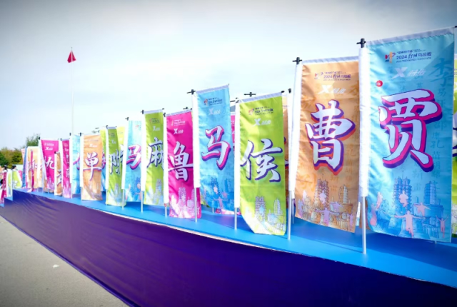 在赛道上,300名身背姓氏大旗的旗手成为一道靓丽的风景线。印有各自姓氏的旗帜随着旗手们的身影在风中飘舞,显得格外亮眼。赛场边时不时有观众大声呼喊着他们的姓氏为选手加油助威,更是有许多人在这过程中认识了不少稀有姓氏。