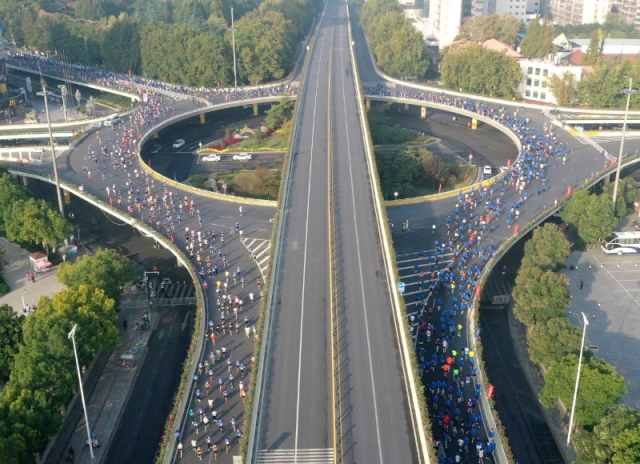 11月3日,参赛选手奔跑在郑州市紫荆山立交桥上(无人机照片)。新华社记者 李嘉南 摄