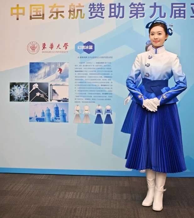 记者了解到,此次亚冬会颁奖礼服由中国东航赞助,联合东华大学和北京服装学院打造。除东华大学的“幻境冰蓝”主题礼服外,北京服装学院也设计了“瑞雪报捷”为主题的颁奖礼服。亚冬会期间,55名中国东航凌燕礼仪志愿服务队成员身着系列合作服装,参与亚冬会相关赛事、商务活动、会议的礼仪保障工作。