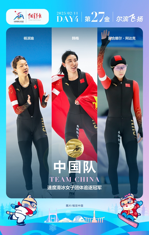 中国青年报客户端哈尔滨2月11日电(中青报·中青网记者慈鑫/文 聂亚栋/海报)在刚刚结束的哈尔滨亚冬会速度滑冰女子团体追逐赛上,由韩梅、杨滨瑜、阿合娜尔·阿达克组成的中国队再夺一金,这场比赛也是本届亚冬会速度滑冰项目的收官之战。中国队至此豪取本届亚冬会14枚速度滑冰金牌中的11枚,创造了参加亚冬会以来在速度滑冰项目上的历史性大捷。不过,日本队并未派最强阵容参加本届亚冬会速度滑冰比赛,而且速度滑冰项目上,欧美实力强于亚洲,因此对于创造亚冬会历史最佳的中国速度滑冰队来说,惊喜之余还需保持冷静头脑,明年的米兰冬奥会才是真正的考验。