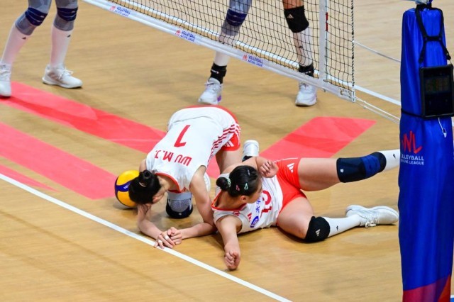 中国队球员吴梦洁(下左)和王奥芊(下右)在比赛中救球。 新华社记者 朱炜 摄