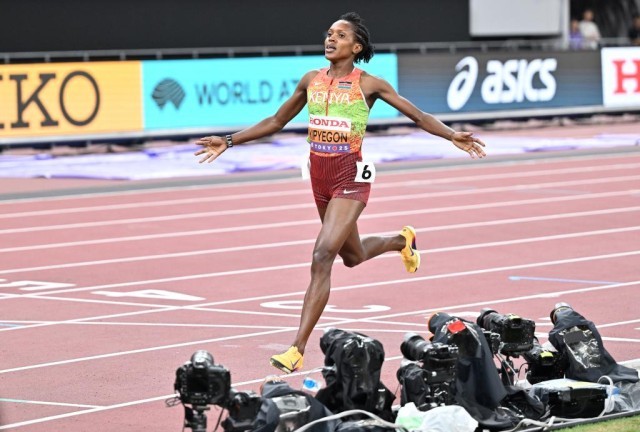 女子1500米决赛中,三届奥运会冠军基普页真全程领跑,在冲刺阶段更是以绝对优势率先冲过终点线,以3分52秒15的成绩摘得金牌,实现个人在该项目上的世锦赛三连冠,这也是她的第5枚世锦赛金牌。