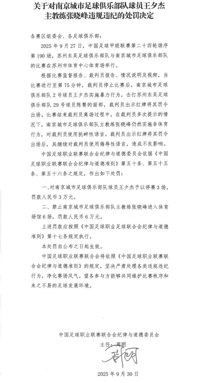 9月30日,中足联处罚决定称:根据比赛监督报告、裁判员报告、情况说明及视频,当比赛进行至第75分钟,裁判员停止比赛后,南京城市足球俱乐部队2号球员王夕杰实施暴力行为,击打苏州东吴足球俱乐部队29号球员陈骜的面部,裁判员出示红牌将其罚令出场。比赛结束裁判员离场过程中,在裁判员多次提示的情况下,南京城市足球俱乐部队主教练张晓峰仍然实施非体育行为,对裁判员使用挑衅性语言,裁判员出示红牌将其罚令出场后,其继续对裁判员使用侮辱性语言,造成不良影响。中足联决定对王夕杰、张晓峰处罚。