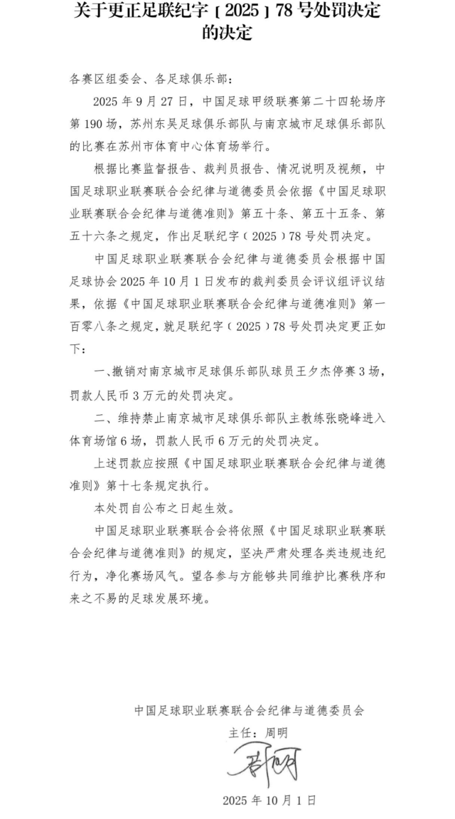 中国足球职业联赛联合会官方网站10月1日发布《关于更正足联纪字(2025)78号处罚决定的决定》。