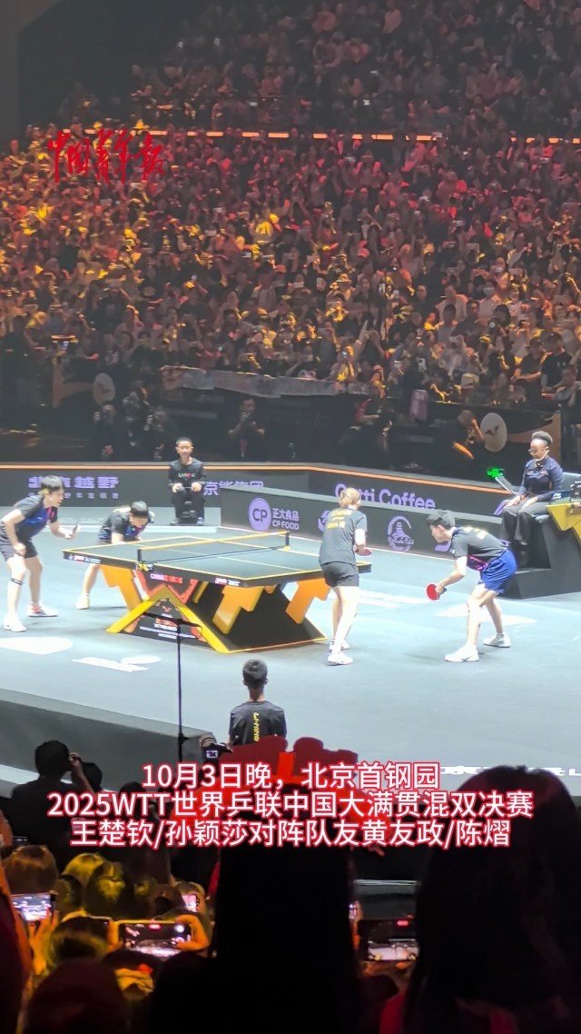 中国青年报客户端北京10月3日电(中青报·中青网记者慈鑫)2025WTT世界乒联中国大满贯今晚产生了首项冠军。巴黎奥运会及三届乒乓球世锦赛混双冠军组合——王楚钦/孙颖莎以3:0战胜队友黄友政/陈熠,这是“莎头”组合首次在中国大满贯混双项目上登顶,也是他俩第五次在WTT大满贯级别的赛事上夺得混双冠军。(中青报·中青网记者慈鑫拍摄、制作视频)