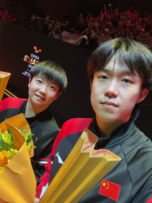 王楚钦/孙颖莎夺冠后自拍。WTT世界乒联供图
