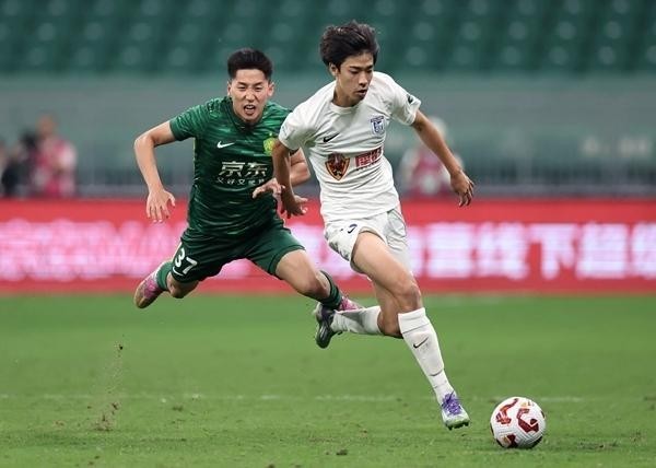 9月26日,北京国安队球员曹永竞(左)与大连英博海发队球员朱鹏宇在比赛中拼抢。新华社记者 张晨/摄