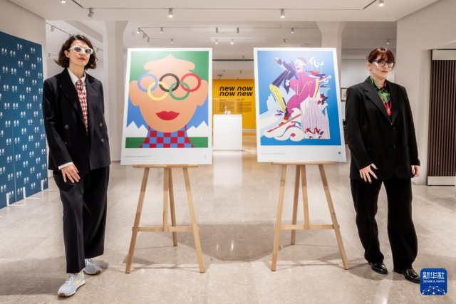 10月22日,艺术家奥林匹娅·扎尼奥利(左)和卡罗琳娜·阿尔塔维拉在发布会上展示她们创作的冬奥会和冬残奥会海报。