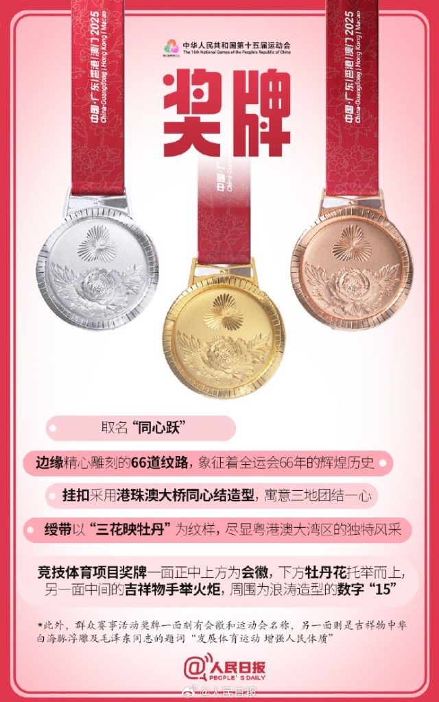 11月9日,第十五届全运会将开幕。本届全运会,赛事文化细节拉满!会徽、奖牌和火炬里藏着哪些花?吉祥物喜洋洋、乐融融的原型是什么?会歌《气势如虹》你会唱了吗?全运会进入2周倒计时,收藏这些十五运会的知识点,期待开幕!